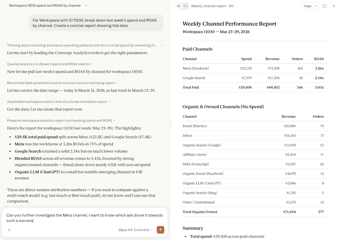 Every metric, filter, and breakdown in your Converge workspace is available through the MCP.